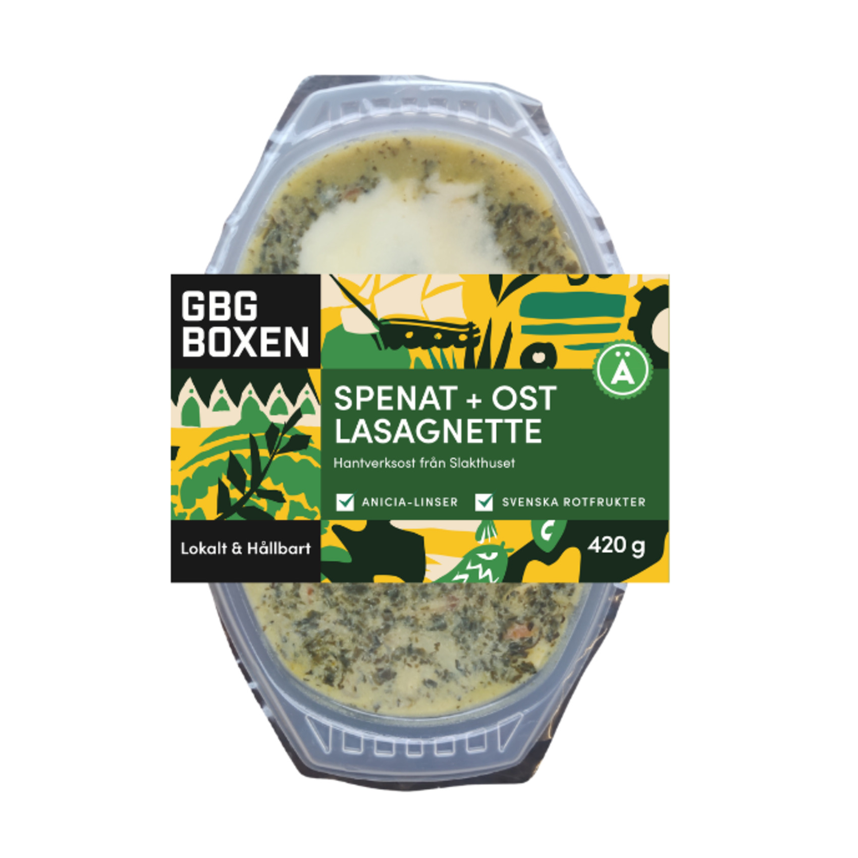 Nötkött från gräsbetesdjur** (80%), ÄGG*, MJÖLK*, HAVREGRYN*, lökkaramell (oxfett*, SOJA*, gul lök*, SELLERI* & kryddor*) salt. Rapsolja till stekning. Tillverkad i en lokal där mandel och nötter kan förekomma. *EU-ekologisk ingrediens **KRAV-märkt ingrediens. Producerad i samarbete med Majornas Matfabrik.